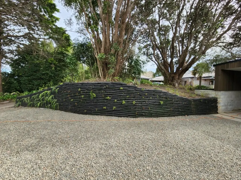 - Visual impact: Traditional concrete or timber retaining structures would have clashed with the bush setting.