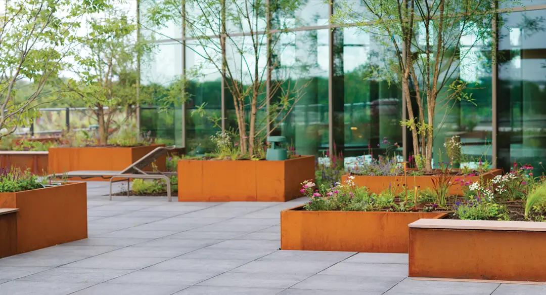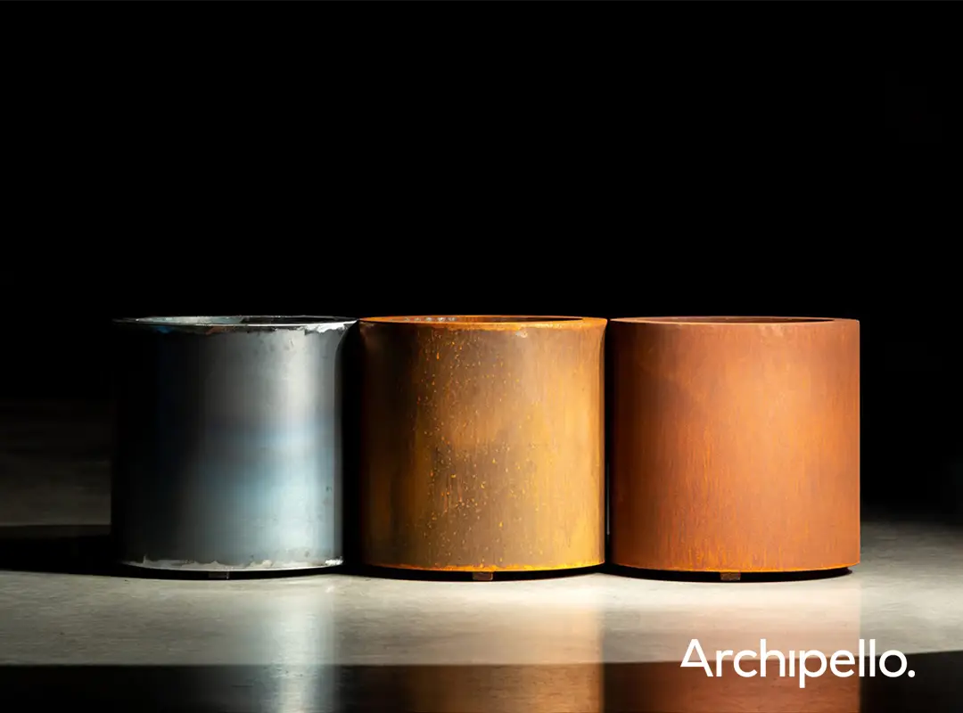 Many products are available in Corten steel, a weathering steel that forms a protective patina over time. This natural rust layer develops gradually, typically over four to five months depending on environmental conditions, and protects the steel from further corrosion while delivering its distinctive warm appearance.