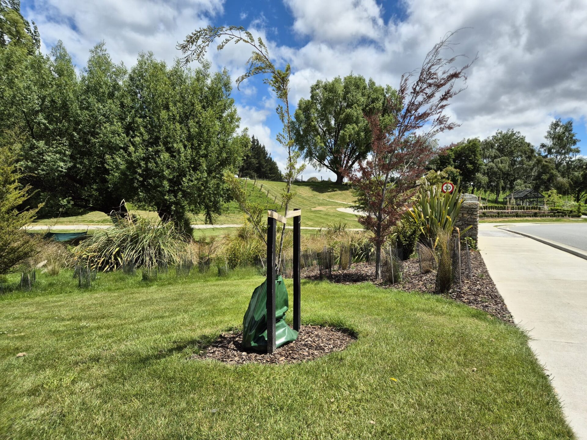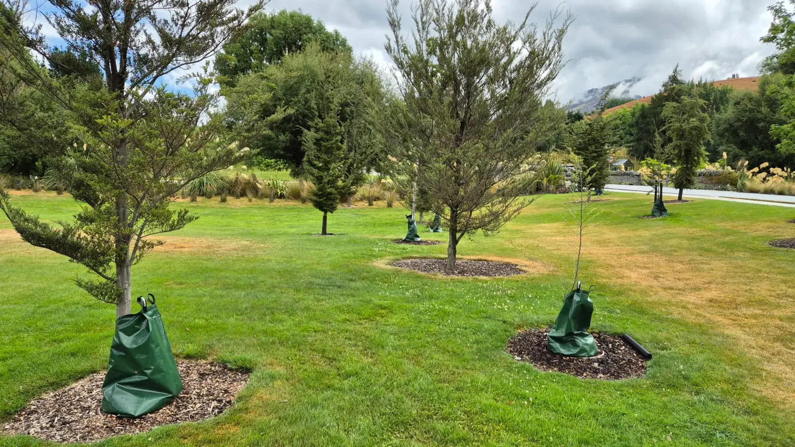 The watering bag features two small holes, one in each gusset, that slowly drips out over the next 5 to 9 hours. This ensures deep water saturation, encouraging deep root growth and efficient watering during dry summers and drought conditions. The deep saturation is also ideal for regions with sandy soils where other options, such as polymer water wells, may not be as effective.